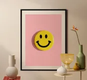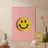 Close-up van een gele smiley-knoop op een roze achtergrond. Minimalistische flatlay met negatieve ruimte, hoge resolutie, fijn gedetailleerd en geïsoleerd op een effen achtergrond. Professionele kleurcorrectie, strakke lijnen en scherpe focus creëren een heldere, esthetische compositie.
