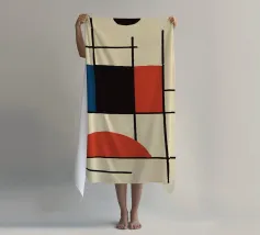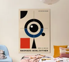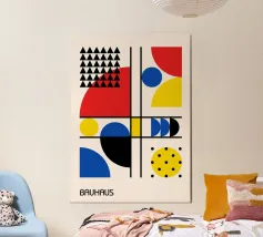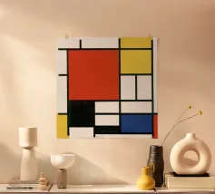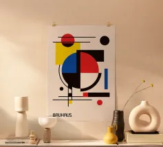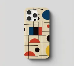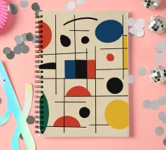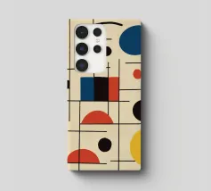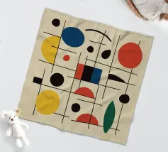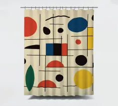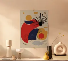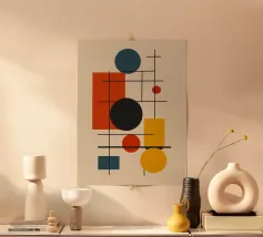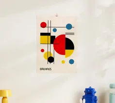 Een verzameling kleurrijke vormen, met name cirkels en lijnen, creëren een dynamische compositie. Het gebruik van primaire kleuren voegt een levendig en modern gevoel toe.