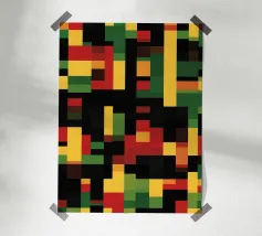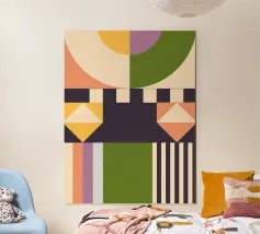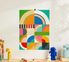 Een compositie van geometrische patronen bestaat uit een cirkel met gedurfde verticale strepen in rood, geel en groen, doorsneden door horizontale balken en omringd door verschillende geruite en effen rechthoeken. Een mix van heldere en gedempte kleuren, samen met scherpe lijnen