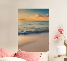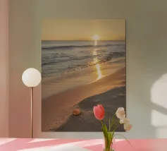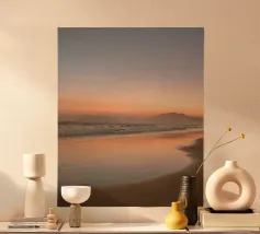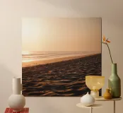 Gouden zonsondergang over rustig strand met zachte golven en zachte hahnemühle