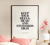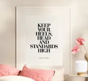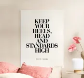 Verfraai je interieur met onze chique typografische print "Keep Your Heels, Head and Standards High". Dit tijdloze Coco Chanel citaat, weergegeven in elegante zwarte schreefletters op een frisse witte achtergrond, dient als dagelijkse herinnering om zelfvertrouwen en klasse te omarmen. Perfect voor slaapkamers, kantoren of kleedkamers, dit veelzijdige ontwerp is ook verkrijgbaar op kleding, telefoonhoesjes en draagtassen. Ideaal voor modeliefhebbers en mondige individuen, het is een attent cadeau of een persoonlijk statement. Inspireer jezelf en anderen met deze geraffineerde print die stijl, evenwicht en elegantie viert.