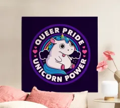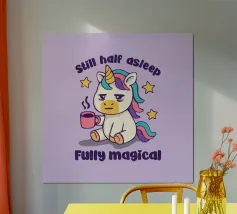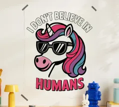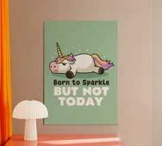 Een schattige eenhoorn met regenboogmanen zit omringd door sterren, vergezeld van de humoristische tekst "I cannot brain today, I has the dumb." De afbeelding is geplaatst tegen een effen achtergrond.