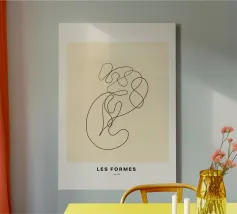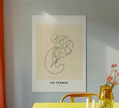 Dit abstracte kunstwerk toont een ononderbroken vloeiende lijn die organische, verstrengelde vormen vormt op een zachtbeige achtergrond. De minimalistische esthetiek creëert een kalm, modern beeld dat ideaal is voor eigentijdse interieurs. Geleverd als een superieur digitaal bestand (7000×5000 px, 300 dpi) met uitstekende precisie en gladde textuur.