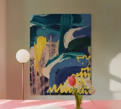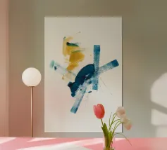 Spatten waterverfachtige verf spatten over een rigide raster. De twee lagen worden over elkaar heen gelegd zonder zich te vermengen, waardoor een visuele dialoog ontstaat tussen organische spontaniteit en een strikt kader. Een schilderij dat zowel hemels als architecturaal is.