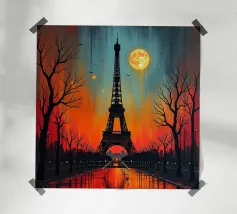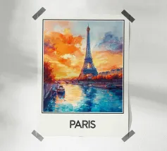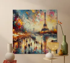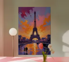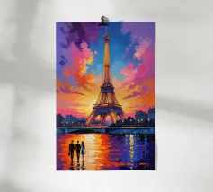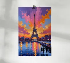 Dit levendige impressionistische schilderij legt de Eiffeltoren vast tijdens de schemering, omgeven door een levendig tapijt van kleuren. Rijke paarse en oranje kleuren domineren de lucht, terwijl de toren majestueus straalt en prachtig weerspiegelt in de Seine. Stelletjes in elegante kleding wandelen langs de verlichte rivieroever en benadrukken de romantische sfeer. De compositie combineert expressieve penseelstreken met een gebalanceerd gebruik van licht en kleur en roept de essentie op van Parijs als een stad van liefde en kunstzinnigheid. Dit schilderij viert de iconische bezienswaardigheid als een tijdloos symbool van romantiek en cultuur.