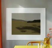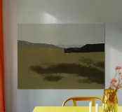 Een sereen landschap met gedempte aardetinten, met een ruig terrein dat zich uitstrekt naar een wazige horizon. Schaduwen en contrasten benadrukken de heuvels in de verte en roepen een gevoel van rust en stilte op.