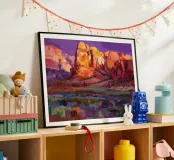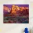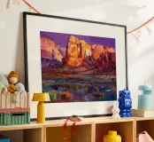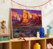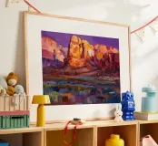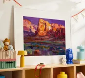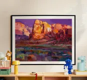 Diep violette en paarse schaduwen vullen een dramatische canyon van rode rotsen. De felle, contrasterende kleuren vangen het intense licht en de stemming van het woestijnlandschap in een moderne, expressieve stijl.