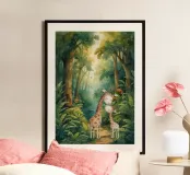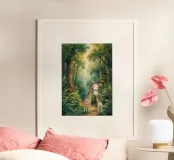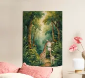 Breng warmte en rust in je interieur met dit betoverende aquarelkunstwerk van een liefhebbende moeder en babygiraffe die een teder moment delen in een weelderig tropisch bos. Perfect voor kinderkamers of op de natuur geïnspireerde interieurs.