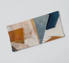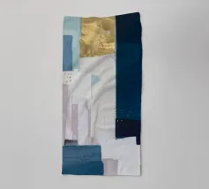 Kleurrijke vlakken stapelen zich op als geologische lagen in abstract patchwork.