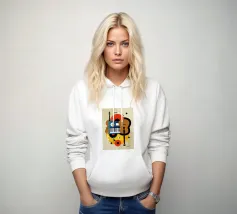 Een modern abstract schilderij met geometrische vormen die gitaren, violen en muzieknoten vormen in een gedurfde, kleurrijke compositie. De achtergrond met textuur en het dynamische arrangement roepen een gevoel van ritme en artistieke expressie op.
