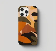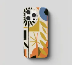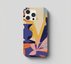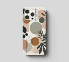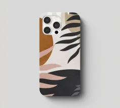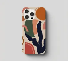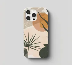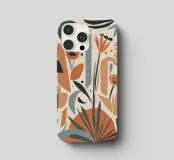 Een moderne abstracte compositie van verschillende gestileerde botanische vormen en bladeren in een palet van terracotta, beige en donkerblauw tegen een lichte achtergrond.