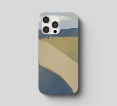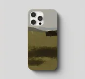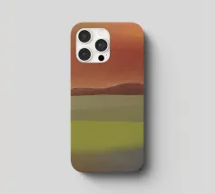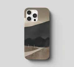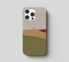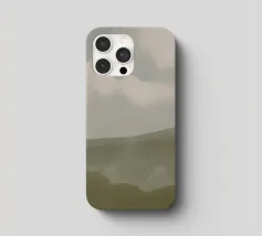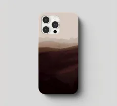 Een sereen landschap met gedempte aardetinten, met een ruig terrein dat zich uitstrekt naar een wazige horizon. Schaduwen en contrasten benadrukken de heuvels in de verte en roepen een gevoel van rust en stilte op.