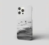 Een opvallende zwart-witfoto van een zwerm meeuwen die sierlijk zweeft boven krachtige oceaangolven. De contrastrijke tinten creëren een dramatische maar serene kustscène, perfect voor een elegante en minimalistische inrichting.