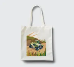 Get an illustration of a classic car driving in the countryside with a unique geometric style.