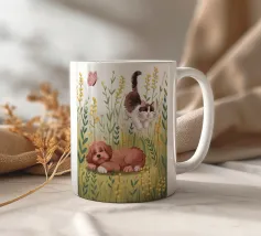 Honden en katten spelen en achtervolgen elkaar in een weiland. De levendige kleuren en dynamische poses geven een gevoel van plezier en energie.