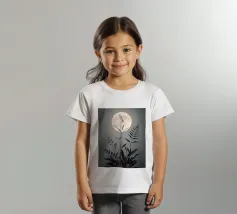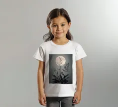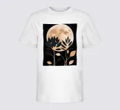 This captivating print features a full moon, bathed in a soft, golden glow, against a deep black backdrop. Two elegant, stylized flowers, one with dark, almost iridescent petals and the other with delicate, golden leaves, stand tall beneath the lunar orb. The interplay of light and dark, combined with the intricate details of the floral elements, creates a truly mesmerizing piece that will add a touch of celestial beauty to any space.