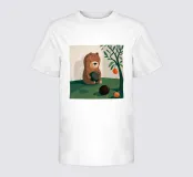 In een grillige tuin houdt een beer een sappige watermeloen vast, omringd door fruit en een weelderige boom. De levendige compositie viert overvloed en de zoetheid van de natuur.