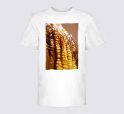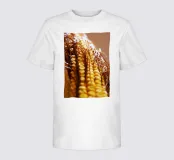 Een rauwe maïskolf verticaal gevangen, waarbij de netjes gelijnde pitten en de vloeiende bruine zijde zichtbaar zijn. De natuurlijke texturen en subtiele kleuren creëren een abstracte maar speelse compositie, waardoor het een eigenzinnige en charmante toevoeging is aan keukens, eethoeken of moderne eclectische ruimtes.