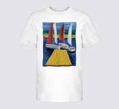 Rode en witte zeilboten rusten naast een houten steiger op stilstaand water, een beeld van zomerse sereniteit en evenwicht.