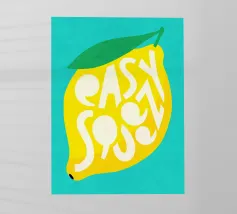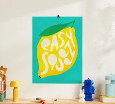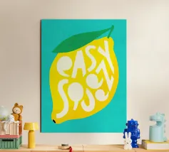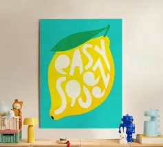 Voeg een vleugje pit toe aan je interieur met dit gedurfde en speelse citroenkunstwerk! Met een levendige handgetekende citroen in zonnig geel met de uitdrukking "Easy Squeezy" in een witte uitgesneden typografische stijl, is dit kunstwerk geplaatst tegen een frisse aqua achtergrond met een vrolijk groen blaadje als contrast. Perfect voor het opfleuren van keukens, kinderkamers, studeerkamers of andere plekken die wel wat fruitig plezier kunnen gebruiken. Ideaal als muurkunst, kussens, notitieboekjes en meer - dit ontwerp brengt eenvoudige, feel-good uitdrukkingen tot leven met een moderne, grafische twist.