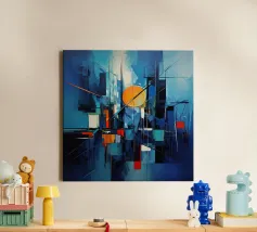 Een levendig en abstract schilderij dat de essentie van een serene zonsondergang vastlegt. Felle oranje en blauwe strepen creëren een dynamisch contrast, terwijl de silhouetten van bomen en een grote, lichtgevende maan diepte en mysterie toevoegen aan de scène. Dit werk is perfect voor eigentijdse ruimtes die op zoek zijn naar een vleugje natuur en rust.