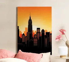 Vier de betoverende schoonheid van de skyline van New York City die wordt weerspiegeld in sereen water. Dit minimalistische silhouet kunstwerk vangt de meest iconische monumenten van de stad, zoals het Empire State Building en One World Trade Center, tegen een rijke achtergrond van oranje en paarse tinten bij zonsondergang. Dit kunstwerk is ideaal voor liefhebbers van een moderne inrichting en roept stedelijke verfijning op met behoud van een rustige en elegante esthetiek.