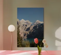 Een frisse lentedag aan de oevers van het meer van Thun, met de besneeuwde toppen van de Berner Alpen. Dit vredige landschap wordt gekenmerkt door rustig water, een charmant Zwitsers dorpje en majestueuze bergen onder een helderblauwe hemel. Vastgelegd met een Fujifilm-camera in natuurlijke tinten - ideaal voor kunstliefhebbers, reizigers en liefhebbers van alpiene fotografie.