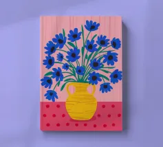Een abstracte, vrijgevormde blauwe vaas bevat een kleurrijk boeket op een roze ondergrond tegen een beige achtergrond, die een speelse, gedeconstrueerde stijl belichaamt.