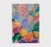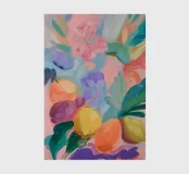 Een kleurrijk, abstract kunstwerk dat de levendigheid van de natuur vastlegt in dynamische penseelstreken. Levendige roze, oranje en groene tinten smelten samen tot een zomers samenspel van fruit, bladeren en bloemvormen. Het motief straalt levensvreugde uit en doet denken aan warme zomerdagen en creatieve vrijheid.