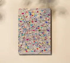 Dit abstracte acrylschilderij vangt de dynamische energie van de action painting-techniek, geïnspireerd door Pollock. Levendige kleurspatten in rood, geel, blauw en wit creëren vloeiende lijnen en complexe patronen die beweging en diepte overbrengen.