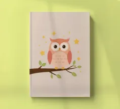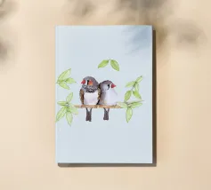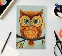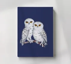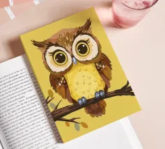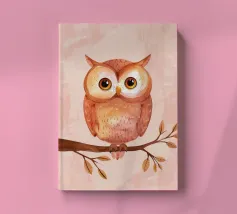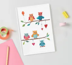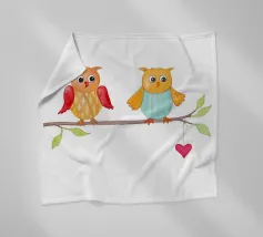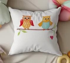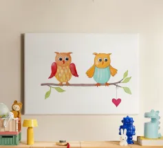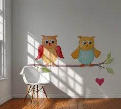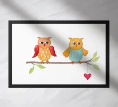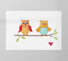 Vriendelijke uiltjes geschilderd in aquarelverf op een tak met een hartje eraan.
