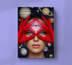 Dit surrealistische kunstwerk toont twee geklede figuren die hand in hand door een oude stenen boog lopen in de richting van een gloeiende hemel met roze en violette tinten. Boven hen zweeft een stralend geometrisch oog dat symbool staat voor bewustzijn, mysterie en dieper begrip. De mix van historische architectuur, zachte zonsondergangkleuren en symbolische iconografie creëert een scène vol betekenis en verbeelding. Ideaal voor fans van spirituele kunst, surrealistische verhalen en tot nadenken stemmende wanddecoratie die aanzet tot nieuwsgierigheid en reflectie.