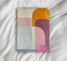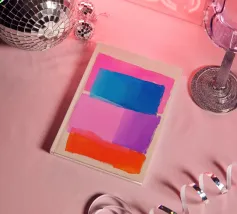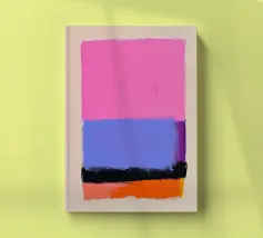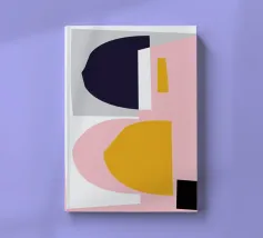Een abstracte compositie met gedurfde geometrische vormen in roze, paars, goud en lichtblauw. Het samenspel van kleuren creëert een dynamische visuele ervaring.
