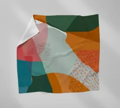 Een abstract kunstwerk met meerdere lagen kleur en textuur, met gescheurd papier en stippelpatronen in een palet van groen, terracotta en oranje, dat diepte en tactiele interesse creëert.