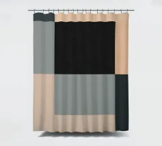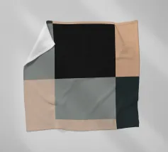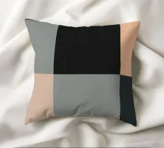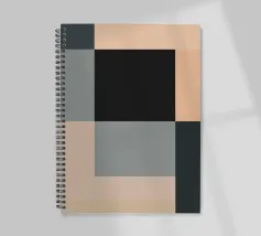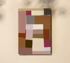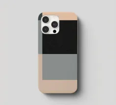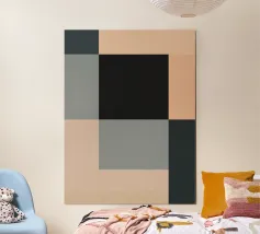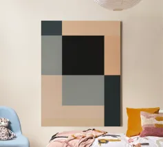 Een geometrische compositie bestaat uit een reeks rechthoeken in gedempte tinten, waaronder zwart, grijs, beige en perzik. De opstelling creëert een moderne, minimalistische esthetiek.