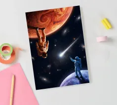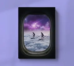 Ervaar de magie van reizen en de nachtelijke hemel met dit sfeervolle kunstwerk van een hand die zachtjes een vliegtuigraam aanraakt met uitzicht op gloeiende woestijnduinen. Een maansikkel schijnt in een diepblauwe hemel vol sterren, waardoor een serene mix van reislust en verwondering ontstaat. Het warme gouden zand contrasteert prachtig met de koele nachttinten en geeft het gevoel van eenzaamheid, reflectie en dromen boven de wereld. Perfect voor reisliefhebbers, minimalisten en fans van filmische, dromerige raamkunst.