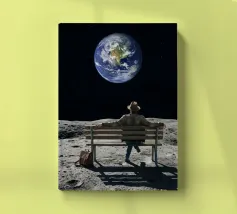 We hebben daar gewoond. Weet je nog? Die wereld wacht nog steeds op ons. ~ paar zittend op een bankje starend naar de aarde surrealistische retro futuristische sterren romantische compositie . horizontale versie