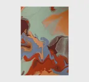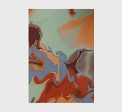 Wervelende patronen van oranje, blauw en bruin stromen over een lichtgroene achtergrond, waardoor een dynamische en vloeiende compositie ontstaat. De kleuren vermengen zich naadloos en doen denken aan gemarmerde oppervlakken.