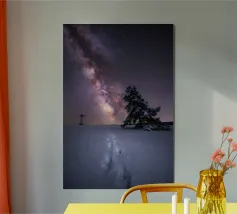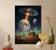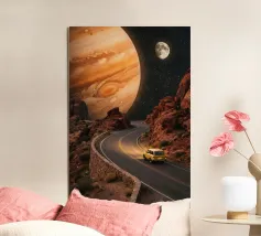 Ervaar de magie van reizen en de nachtelijke hemel met dit sfeervolle kunstwerk van een hand die zachtjes een vliegtuigraam aanraakt met uitzicht op gloeiende woestijnduinen. Een maansikkel schijnt in een diepblauwe hemel vol sterren, waardoor een serene mix van reislust en verwondering ontstaat. Het warme gouden zand contrasteert prachtig met de koele nachttinten en geeft het gevoel van eenzaamheid, reflectie en dromen boven de wereld. Perfect voor reisliefhebbers, minimalisten en fans van filmische, dromerige raamkunst.