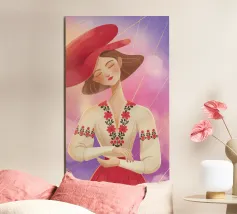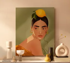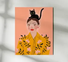 Dit kunstwerk toont een persoon met kort blond haar die een gebloemde jas draagt en een boek vasthoudt. De felgele achtergrond versterkt de chique en stijlvolle uitstraling.