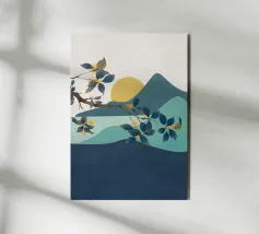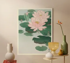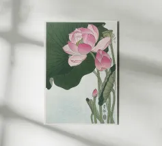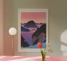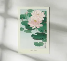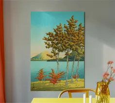 Een houtsnede met lotusbladeren en waterlelies op de oever, met een ondergaande zon aan een lichtroze hemel boven een kalm meer. Aan de horizon op de achtergrond is een eiland te zien, omringd door bomen en bergen in de verte. Dit kunstwerk belichaamt de esthetiek van de Edo-periode en toont de eenvoud van de houtsnijtechnieken en de rustige kleuren.