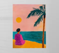 Sierlijk digitaal schilderij van een zelfverzekerde vrouw in een vloeiend wit gewaad zittend op een rotsstrand met palmbomen en een levendige oranje zon. Dit stijlvolle, serene kusttafereel roept luxe, rust en tropische sferen op. Perfect voor modeliefhebbers, liefhebbers van moderne kunst en tropische woondecoraties. Voegt verfijning en warmte toe aan woonkamers, slaapkamers of kantoren. Ideaal cadeau voor kunstverzamelaars en fans van eigentijdse portretten met een op het strand geïnspireerd thema.
