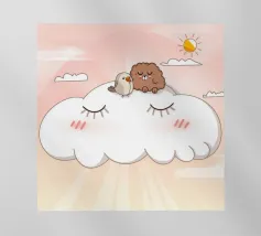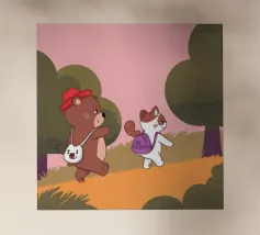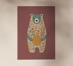 In een grillige tuin houdt een beer een sappige watermeloen vast, omringd door fruit en een weelderige boom. De levendige compositie viert overvloed en de zoetheid van de natuur.