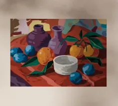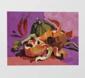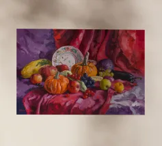 Een stilleven of oogsttafereel met een grote oranje pompoen of pompoen, rode chilipepers en groene bladeren, mogelijk aan de wijnstok. De achtergrond is een mix van warme en koele tinten.