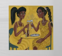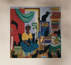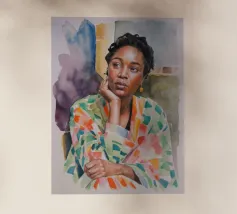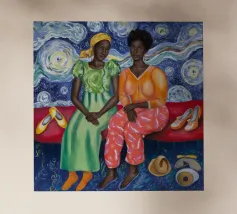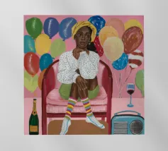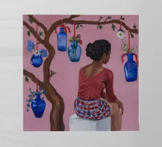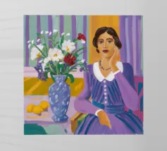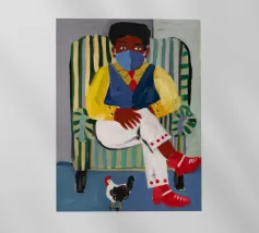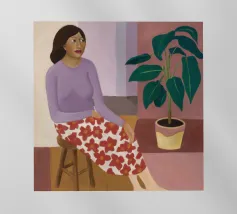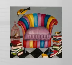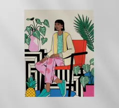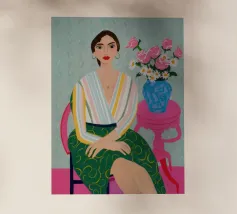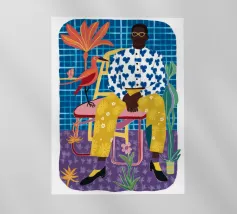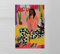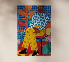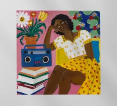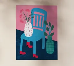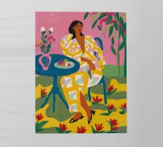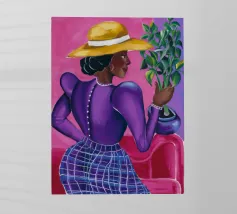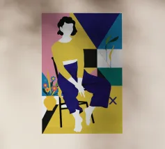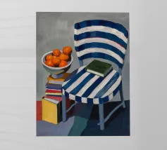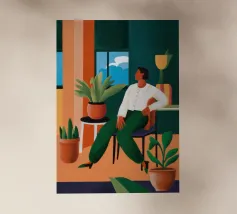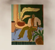 Dit kunstwerk toont een persoon die op een gestreepte stoel zit, omringd door zonnebloemen en een groene tas. De achtergrond is gedempt bruin en creëert een rustieke en reflecterende sfeer.