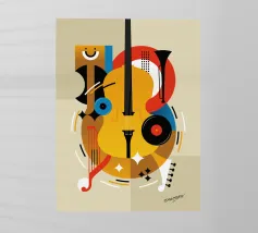 Een opvallend abstract kunstwerk met een viool in kubistische stijl, met overlappende geometrische vormen en een rijk kleurenpalet van aardetinten, blauw en goud. De compositie benadrukt textuur, diepte en beweging.