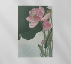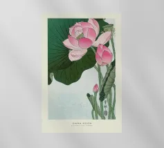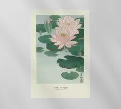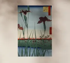 Een houtsnede met lotusbladeren en waterlelies op de oever, met een ondergaande zon aan een lichtroze hemel boven een kalm meer. Aan de horizon op de achtergrond is een eiland te zien, omringd door bomen en bergen in de verte. Dit kunstwerk belichaamt de esthetiek van de Edo-periode en toont de eenvoud van de houtsnijtechnieken en de rustige kleuren.