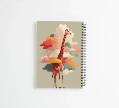 Een speelse en dromerige illustratie van een grote giraffe die oprijst boven een grillige lucht vol zachte, kleurrijke wolken. Het retro-moderne kleurenpalet in warm rood, geel en crème creëert een serene en fantasierijke sfeer - perfect voor een kinderkamer of een creatieve werkruimte. Gedrukt in hoge resolutie voor verbluffende details en visuele impact.