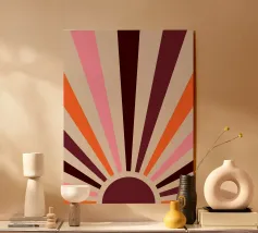 Een levendige uitbarsting van gestileerde zonneschijn geschilderd in brede, gestructureerde strepen van warm geel, koraalroze en verbrand oranje. Dit minimalistische kunstwerk roept de gouden gloed op van een vintage zomerochtend, perfect om energie en retro charme toe te voegen aan moderne interieurs.