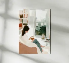 Deze serene digitale poster vangt een rustig moment van contemplatie bij een groot raam. Een vrouw, weergegeven in een eenvoudige, elegante stijl, zit comfortabel op een bank, met een warme mok koffie in de hand en kijkt uit over een gedempt, abstract groen landschap. Het kunstwerk wordt gekenmerkt door een verfijnd neutraal en aardetintenpalet - crèmewit, zacht terracotta, bruin en saliegroen - geaccentueerd door een gestileerde boekenplank. De zichtbare, dikke impasto penseelstreken geven de hele scène een rijke, texturale kwaliteit. Deze digitale download van hoge kwaliteit (7000x5000 pixels, 300 dpi) is perfect voor het toevoegen van een